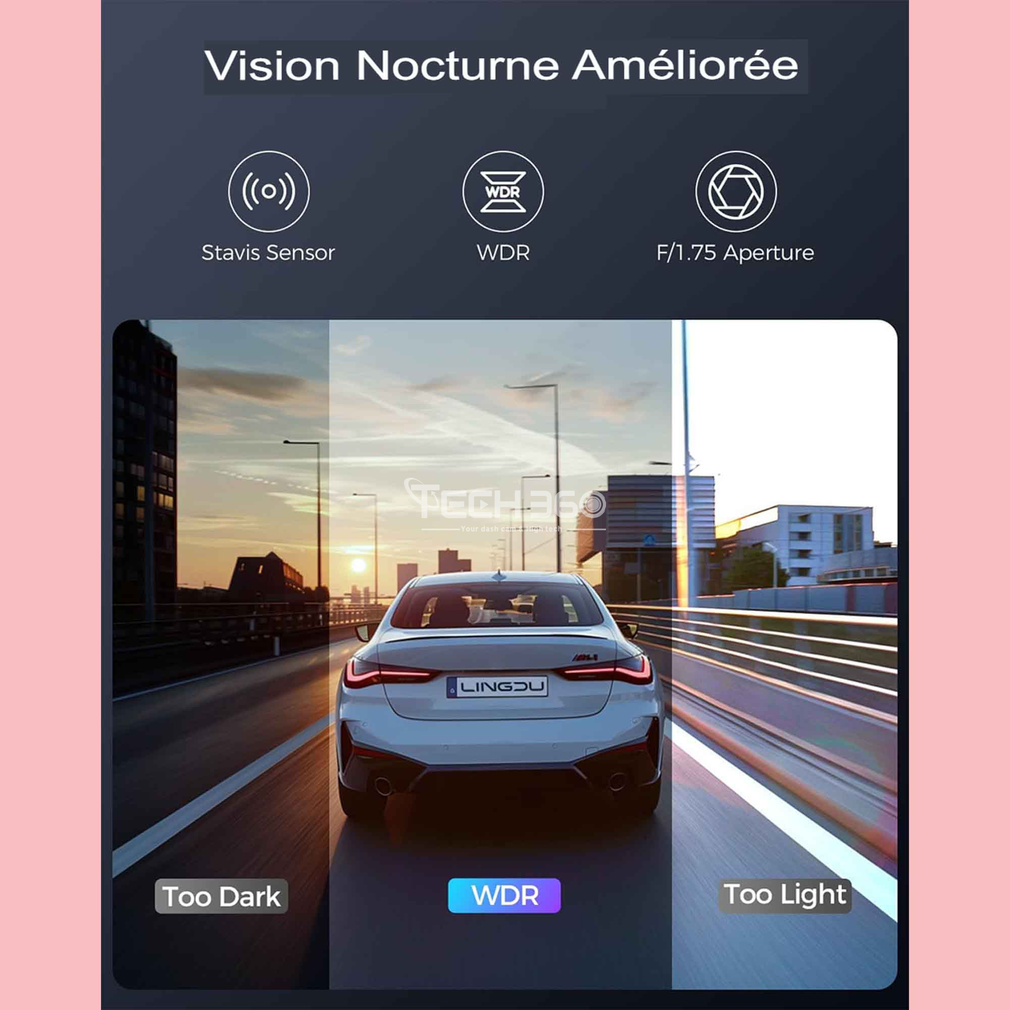 La caméra de tableau de bord LINGDU se distingue par sa Super Vision Nocturne, offrant une performance exceptionnelle en conditions de faible luminosité. Grâce à une ouverture de F1.75, la caméra capte davantage de lumière, ce qui est crucial pour enregistrer des vidéos claires et détaillées la nuit.