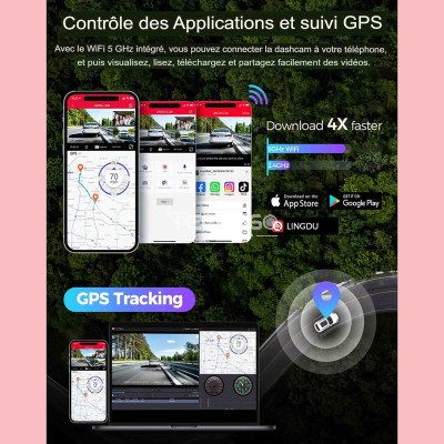 La cam car LD08 peut être connectée à votre téléphone via le WiFi 5 GHz, ce qui vous permet de visualiser, lire, télécharger et partager facilement des vidéos dans l'application LINGDU. Le WiFi 5,8 GHz vous permet de télécharger une vidéo de 800 Mo en moins de 10 secondes.