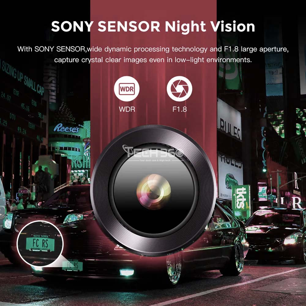 La caméra de surveillance de voiture AZDOME M550 de la large ouverture F/1.8 garantit des images de qualité supérieure, de jour comme de nuit. Grâce à la technologie de focale exclusive exploitée par l'objectif grand-angle à 6 verres, la capture de détails plus fins, tels que des plaques d'immatriculation, est réalisée avec une précision accrue, même dans des conditions de faible luminosité.