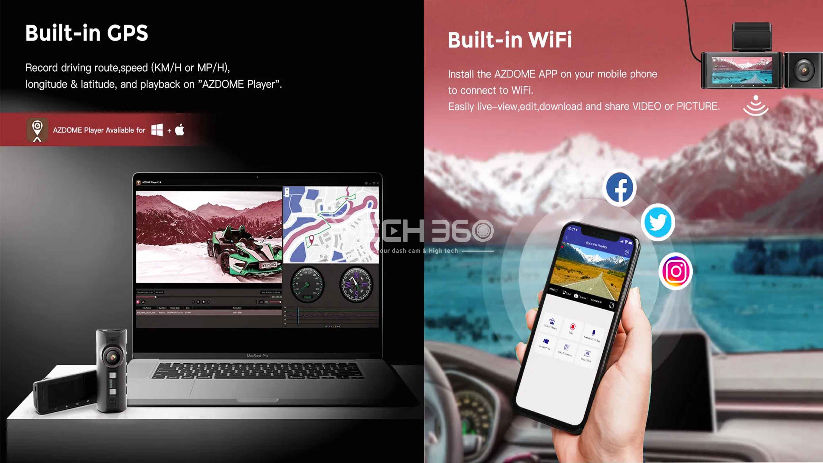 Le GPS intégré assure un enregistrement précis de l'heure, de la date, de la position et de la vitesse en temps réel. Lors de la lecture des vidéos via le lecteur sur PC, les coordonnées GPS afficheront votre itinéraire et votre emplacement sur la carte. La fonction WiFi permet un contrôle à distance de la cam car AZDOME M550, facilitant la visualisation, le téléchargement, la gestion et le partage des vidéos sur les réseaux sociaux via l'application AZDOME sur votre téléphone portable.