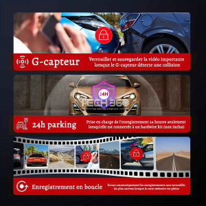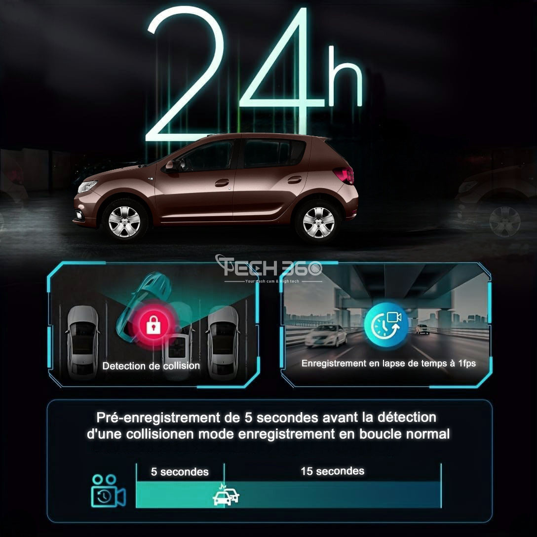 Le mode de surveillance 24 heures sur 24 ne s'active que lorsqu'il est alimenté par une source externe. En cas d'impact sur votre voiture atteignant le niveau du capteur G, la caméra s'allume et enregistre une vidéo d'une minute, puis la verrouille et la sauvegarde. Étant équipée d'un super condensateur, il est recommandé de toujours connecter la Dash Cam à une alimentation externe (Hardwire kit JYX02) pendant son utilisation