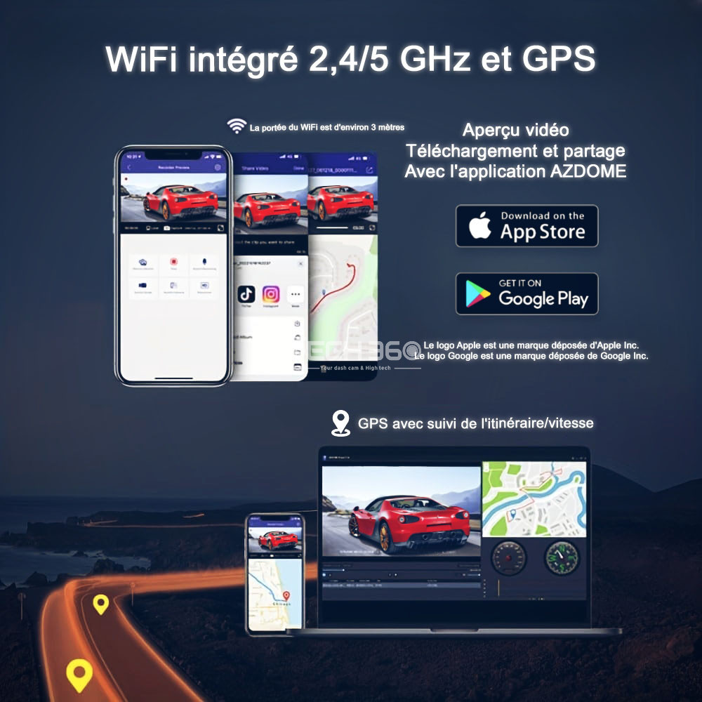 Vous avez la possibilité de visualiser et de télécharger les vidéos directement sur votre smartphone grâce à l'application WiFi et à l'application AZDOME de la caméra de voiture de tableau de bord, éliminant ainsi le besoin de retirer la carte TF pour les vérifier sur un ordinateur. Il est à noter que le WiFi de la caméra de tableau de bord ne permet pas une connexion à Internet, mais il offre une portée d'environ 9 pieds pour que vous puissiez vous connecter à votre téléphone.