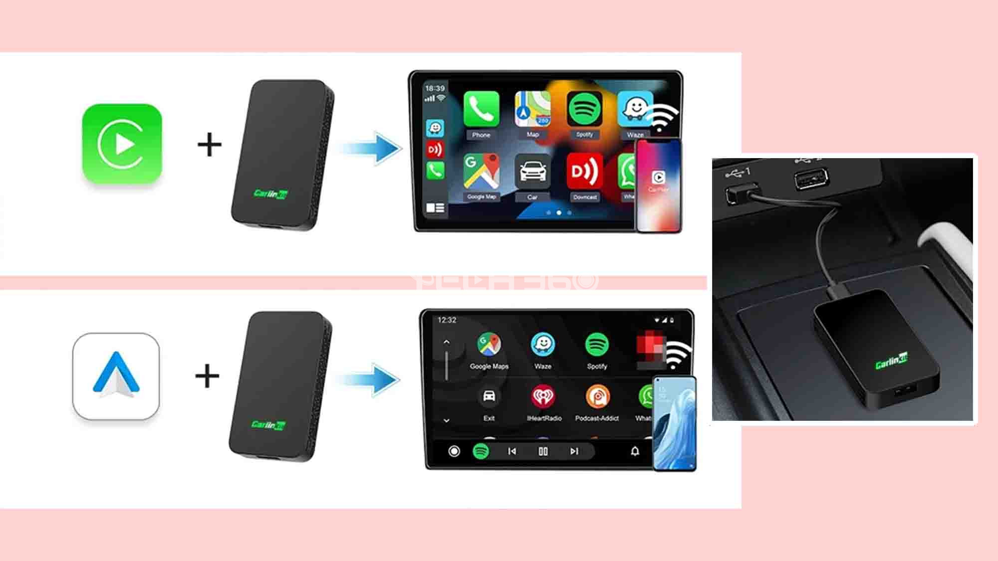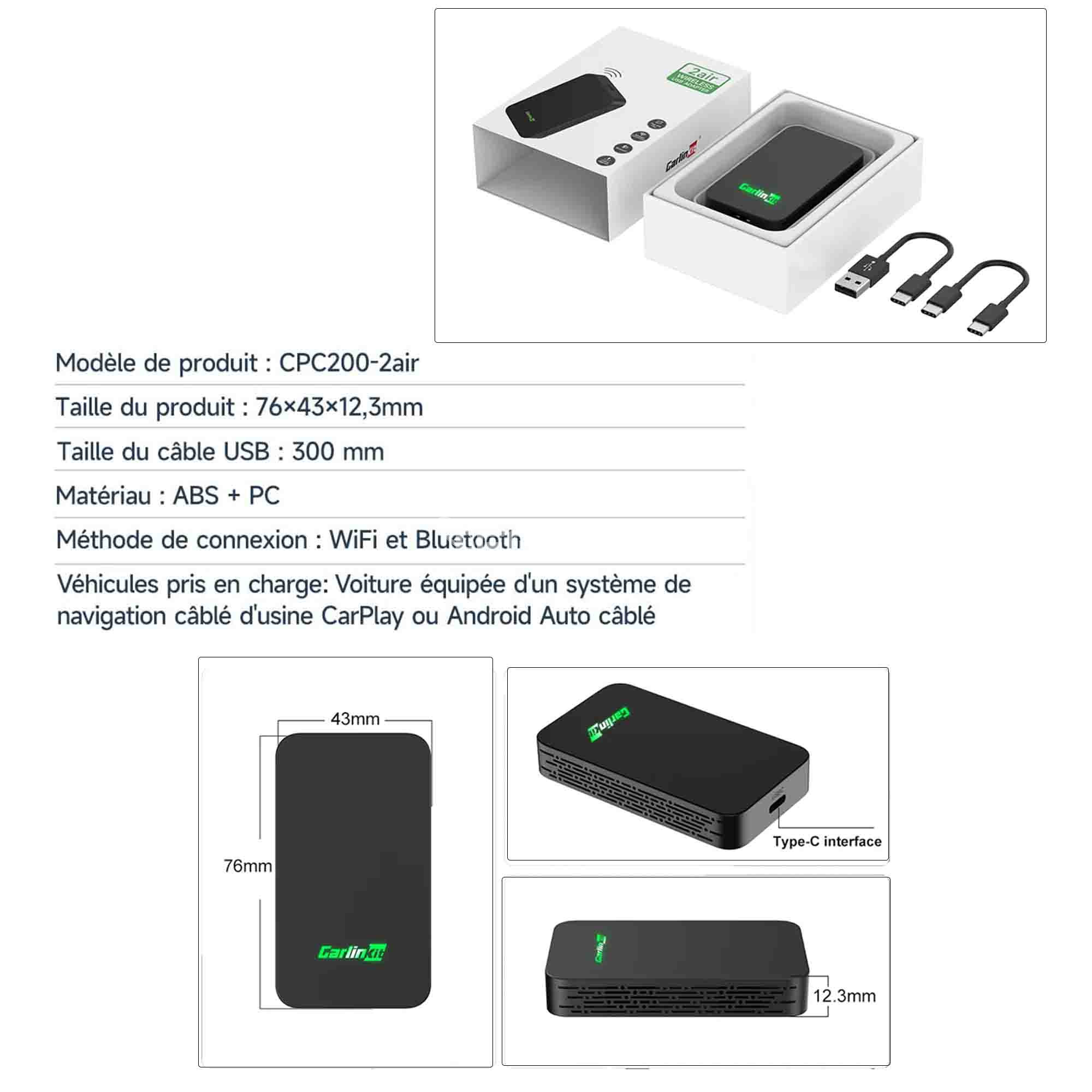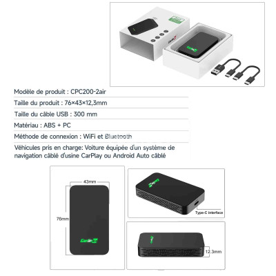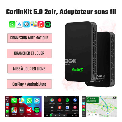Le Carlinkit 5.0 2Air sans fil prend en charge CarPlay sans fil et Android Auto sans fil (2 en 1). Il est conçu pour convertir le CarPlay filaire de votre voiture en CarPlay sans fil ou convertir Android Auto filaire en Android Auto sans fil. Cela vous permet de vous débarrasser des câbles encombrants. Veuillez toutefois confirmer que votre voiture prend en charge CarPlay ou Android Auto avant d'acheter.