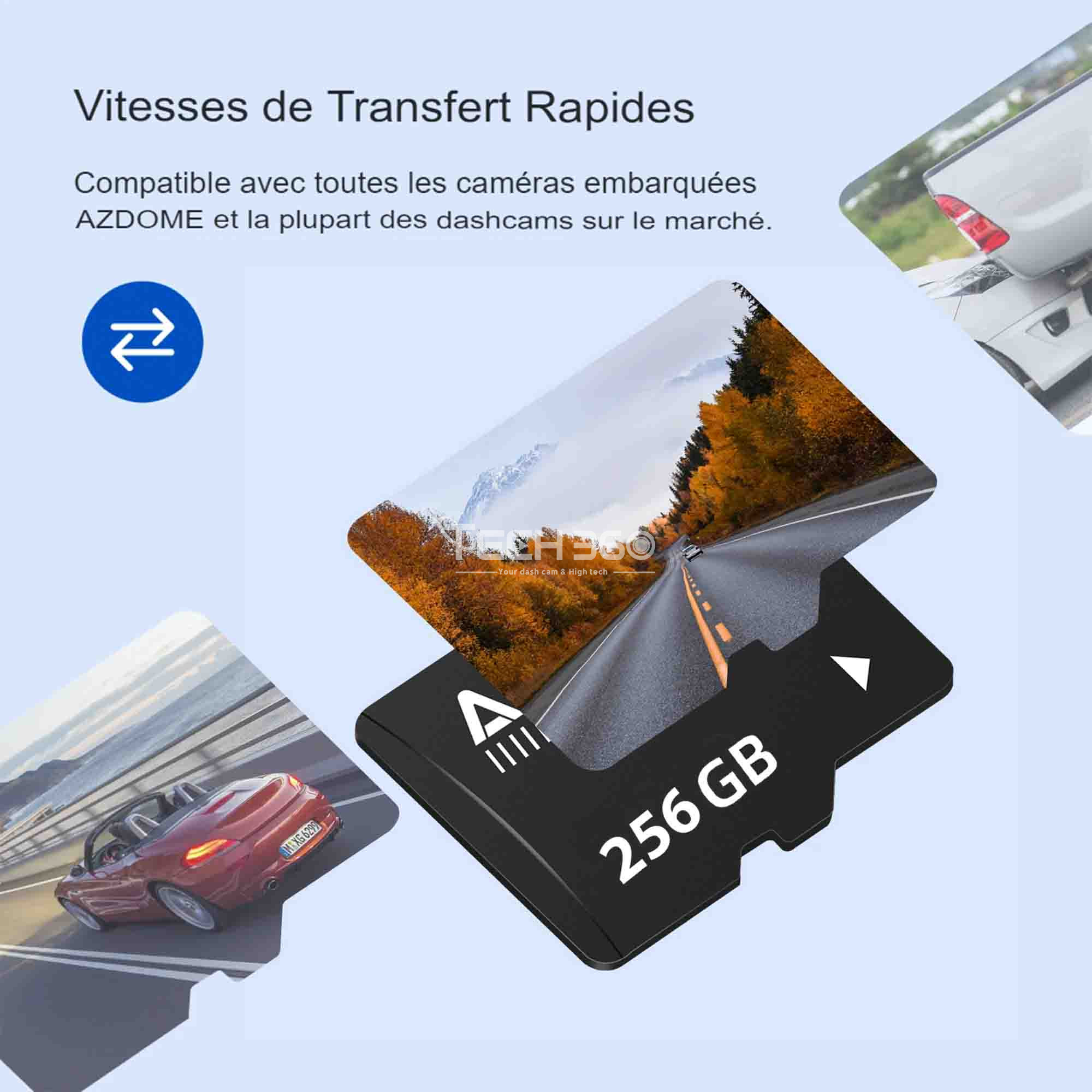 Nous effectuons une évaluation rigoureuse de la compatibilité de nos cartes SD avec toutes les caméras embarquées pour garantir des performances exceptionnelles et une durabilité à long terme. Nous vous recommandons vivement d'utiliser les cartes SD de la marque AZDOME pour obtenir des performances optimales. Les cartes SD tierces peuvent ne pas répondre aux normes de fonctionnement de nos caméras embarquées à trois canaux.