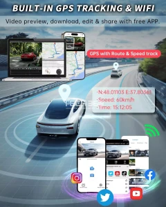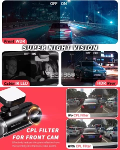 La caméra intérieure avec 4 LED infrarouges peut capturer avec précision le conducteur et les passagers en faible luminosité. Équipée de la technologie WDR et HDR ainsi que de capteurs d'image CMOS améliorés pour la caméra avant et arrière, la caméra de voiture équilibre automatiquement les zones claires et sombres et enregistre des vidéos et images nettes même dans des conditions de faible éclairage la nuit. Idéale pour les taxis, Uber, Lyft et les familles.