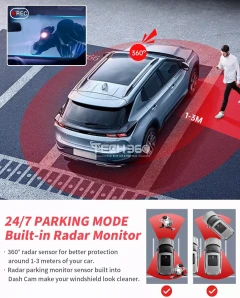 La dashcam est équipée d'une surveillance radar intelligente. Lorsque la voiture est éteinte et qu'un objet se déplace dans un rayon de 1 à 3 mètres du véhicule, l'appareil se met en marche et enregistre. La caméra de voiture dispose de trois niveaux de protection basse tension réglables. Si la tension est trop basse, l'alimentation sera coupée pour protéger la batterie du véhicule.