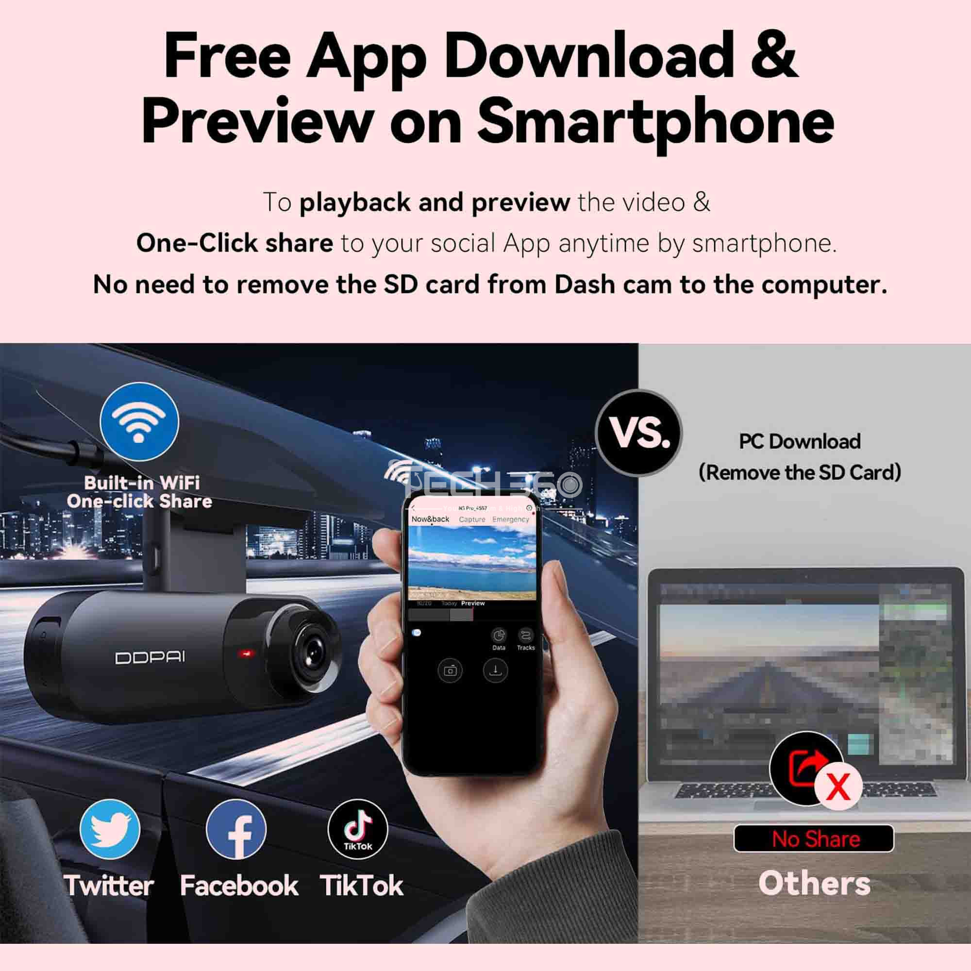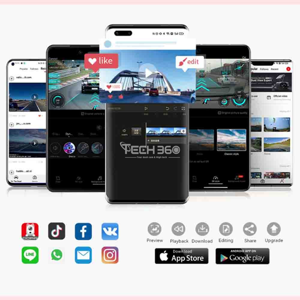 Partagez et connectez-vous au monde entier. Dotée d'un WiFi 2,4 GHz intégré, la dash cam Mola N3 Pro permet de configurer l'appareil, de regarder en direct, de rejouer ou de télécharger des vidéos, et de mettre à jour le micrologiciel via OTA. Des outils faciles à utiliser vous permettent de créer votre propre chef-d'œuvre cinématographique avec des effets spéciaux, des filtres et de la musique. Partagez vos vlogs et connectez-vous au monde entier grâce à cette application intuitive.