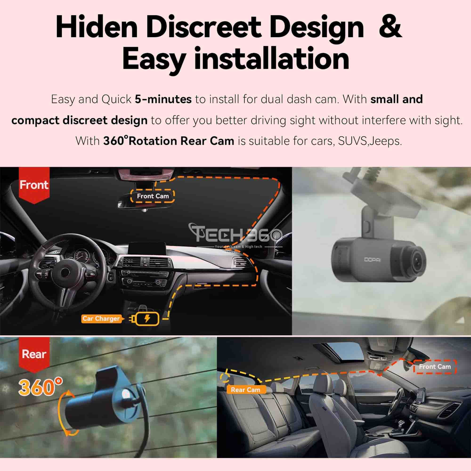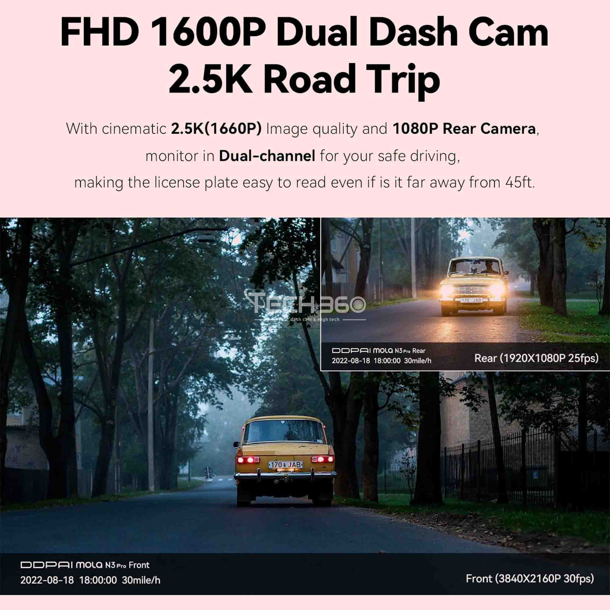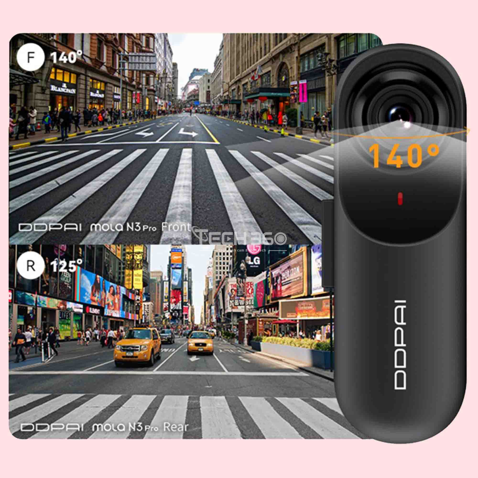 Avec la fonction double vue de la caméra de voiture Mola N3 Pro, surveillez les routes devant et derrière vous en même temps. La dash cam Mola N3 Pro double grand-angle capturent tous les piétons et véhicules autour de la voiture, caméra 360 °, offrant ainsi une preuve suffisante et vous protégeant contre les accidents potentiels et les problèmes de responsabilité. Un angle de vision large de 140° garantit une vue étendue de la route, sans les effets de distorsion liés à un angle de 170°, qui pourrait provoquer une vision en œil de poisson. De plus, la caméra arrière grand-angle de 125°, avec son câble d'extension de 20 pieds, assurant une couverture complète de votre environnement routier.