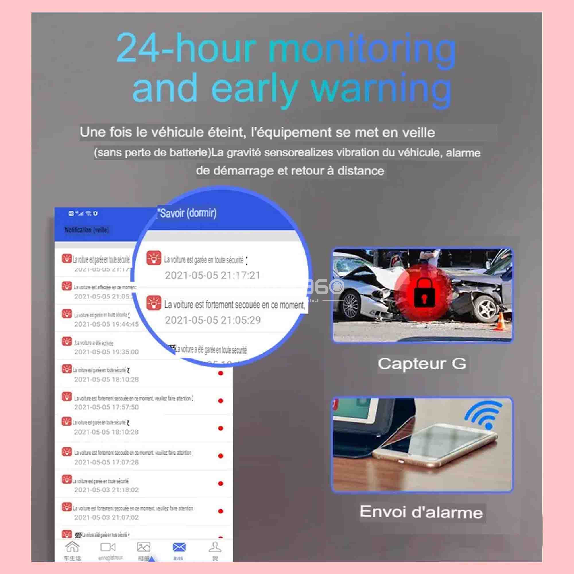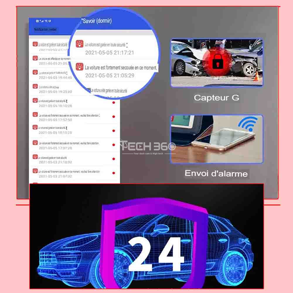 La cam car TECH360 offre une surveillance 24 heures sur 24 avec alerte précoce est assurée par le système. Même lorsque le véhicule est éteint, l'équipement passe en mode veille sans compromettre la batterie du véhicule. Le capteur G détecte toute vibration du véhicule, déclenchant une alarme en cas de tentative de démarrage non autorisée. De plus, cette fonctionnalité permet un retour à distance, offrant aux utilisateurs la possibilité de recevoir des alertes en temps réel et de prendre des mesures appropriées pour assurer la sécurité de leur véhicule, même lorsqu'ils ne sont pas physiquement présents.