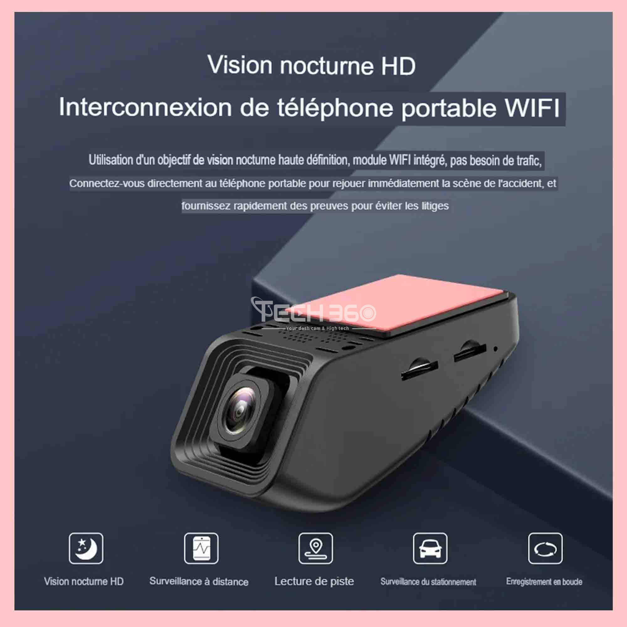 Grâce à un objectif de vision nocturne haute définition, la caméra de voiture TECH360 est capable de capturer des détails précis et des images nettes même lorsque l'éclairage ambiant est limité. Cette caractéristique améliore significativement la visibilité la nuit, permettant aux utilisateurs de bénéficier d'une surveillance efficace et de la capture de vidéos de haute qualité, même dans des environnements sombres. Elle renforce ainsi la fiabilité et l'utilité de la dashcam, que ce soit pour des besoins de sécurité, de documentation ou d'enregistrement en conduite nocturne.