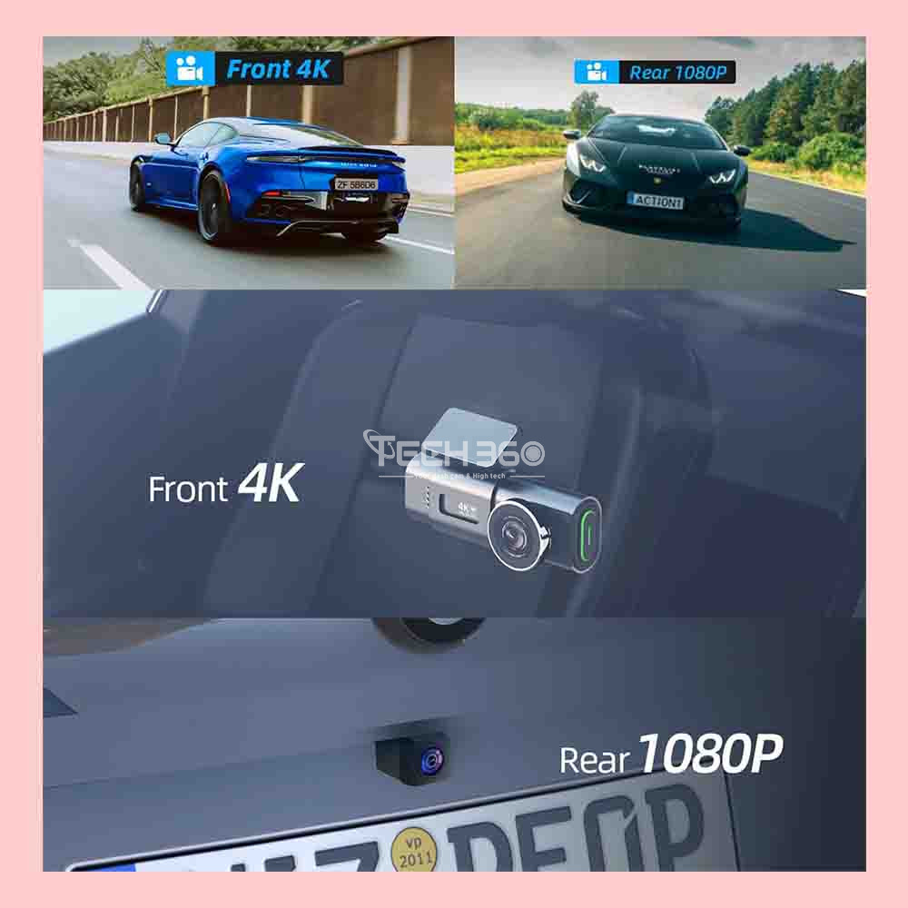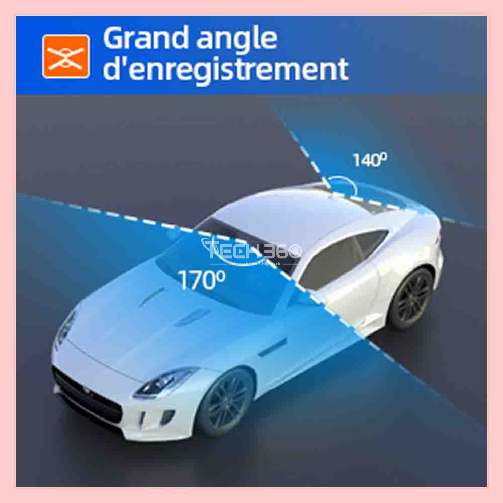 La double caméra de tableau de bord pour voiture TECH360 offre la possibilité d'enregistrer des vidéos en résolution ultra haute définition 4K à l'avant (3840*2160) et en 1080P à l'arrière, permettant ainsi une capture nette des plaques d'immatriculation et des panneaux de signalisation. Avec un objectif ultra grand angle de 170° à l'avant et de 140° à l'arrière, elle couvre aisément trois voies tout en réduisant les angles morts dans le champ de vision.