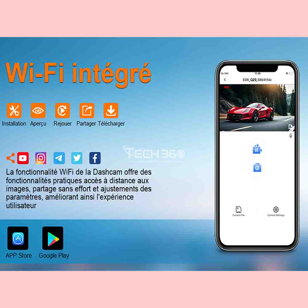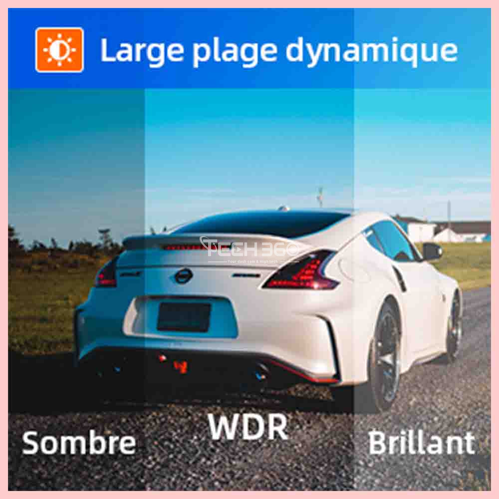 La dashcam TECH360 est équipée de fonctionnalités de vision nocturne avancées ainsi que de la technologie WDR. Ces caractéristiques permettent d'obtenir un rendu optimal même dans des conditions de faible luminosité, en ajustant automatiquement l'exposition pour un équilibre parfait.