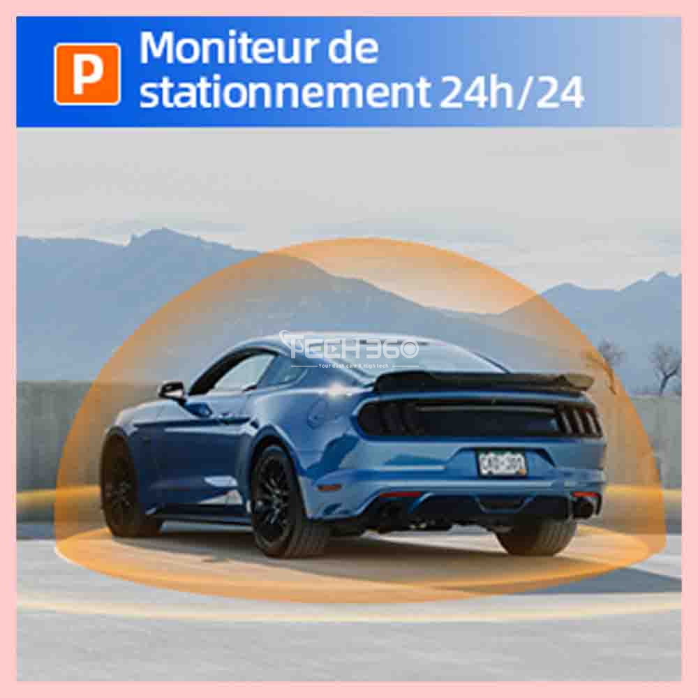 En cas de vibrations ou de collision détectées après le stationnement, la cam car TECH360 avant-arrière démarrera automatiquement l'enregistrement et verrouillera la vidéo. Pour activer une surveillance continue 24h/24 en mode stationnement, l'acquisition d'un "Kit filaire" supplémentaire (non inclus) est requise.