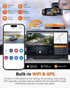 Le WiFi 5G intégré permet un aperçu instantané, l’édition et le téléchargement rapide des vidéos directement via l’application gratuite Vantrue, offrant une grande praticité en conduite.